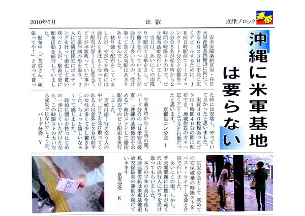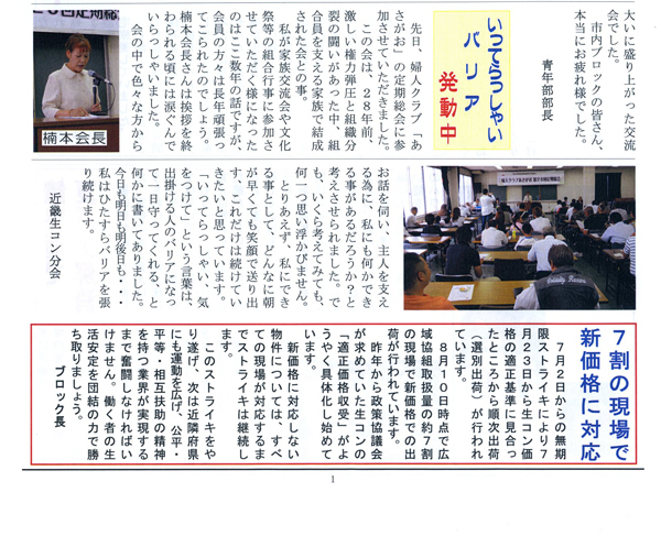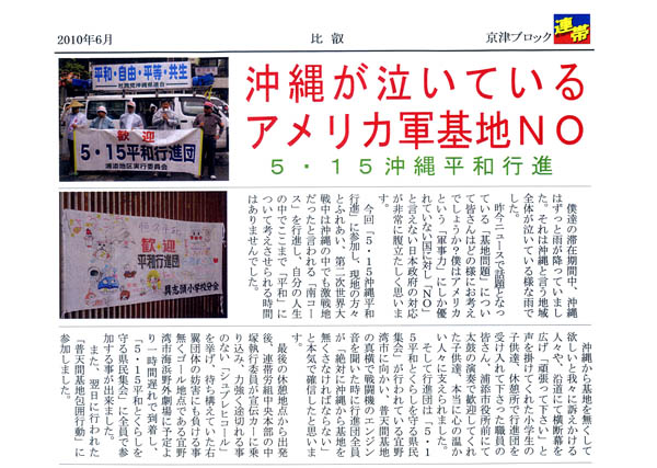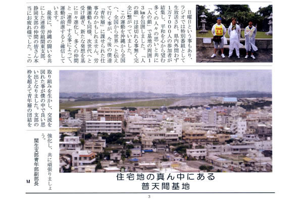 「集団自決」を巡る教科書検定問題で、沖縄の県民が検定意見の撤回を求めて立ち上がり、11万6千人もの県民大集会を開催しました。これを沖縄県だけの問題ではなく、日本全体の問題としてとらえ、連帯労組関西生コン支部は文科省の検定意見撤回を求める運動を展開。京津・湖東・朝日の3ブロックは、この運動を関西から全国に広める活動の一環として、大学教授の講演とライブコンサートをジョイントさせた集会を沖縄県人会の協力を得て企画。このたび、関西地区生コン支部OBより、沖縄県人会のメンバーと反戦フォークシンガーの佐渡山豊さん、女性サックス奏者のスウィング・マサさんを紹介していただき、実現の運びとなりました。 |